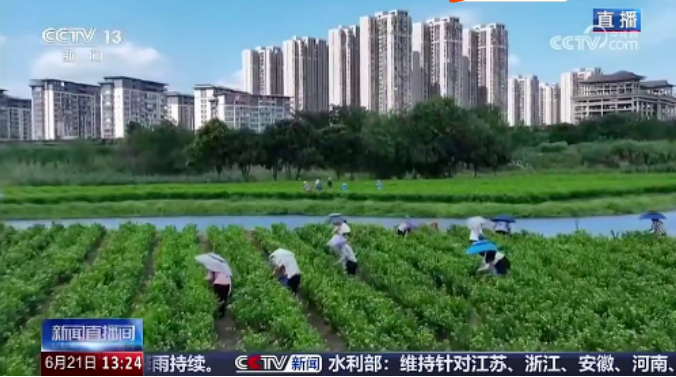 央视节目聚焦位于帝封江公园内的一片200多亩的茉莉花田。从高空俯瞰,帝封江水面波光粼粼,澄澈江水与湛蓝天空在远处交汇,洁白茉莉花田如丝带般沿江岸铺展,形成水天相接的绝美景观。微风拂过,馥郁花香随风弥漫,央视记者感叹道:“我感觉到了视觉和嗅觉的双重享受。”