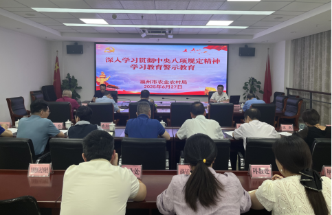 为推动深入贯彻中央八项规定精神学习教育走深走实、入脑入心、见行见效,推进作风建设常态化长效化,2025年6月27日,福州市农业农村局开展深入贯彻中央八项规定精神学习教育专题党课。局领导班子成员、四级调研员、机关各处室及直属单位负责人、各支部党员干部参会。