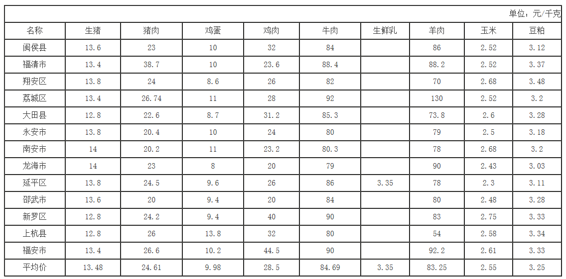 福建省2026年第6周畜产品及饲料集市价格周报